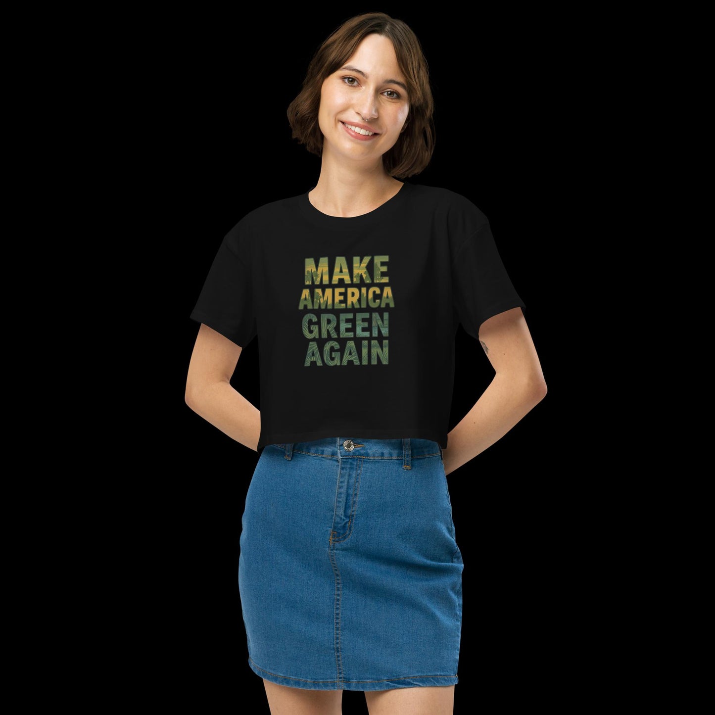 Make a bold statement with this effortlessly cool crop top. Featuring the iconic “Make America Green Again” slogan, this tee combines style with a message. The relaxed fit and soft cotton fabric keep you comfy while turning heads—perfect for festivals, errands, or backyard hangs.
