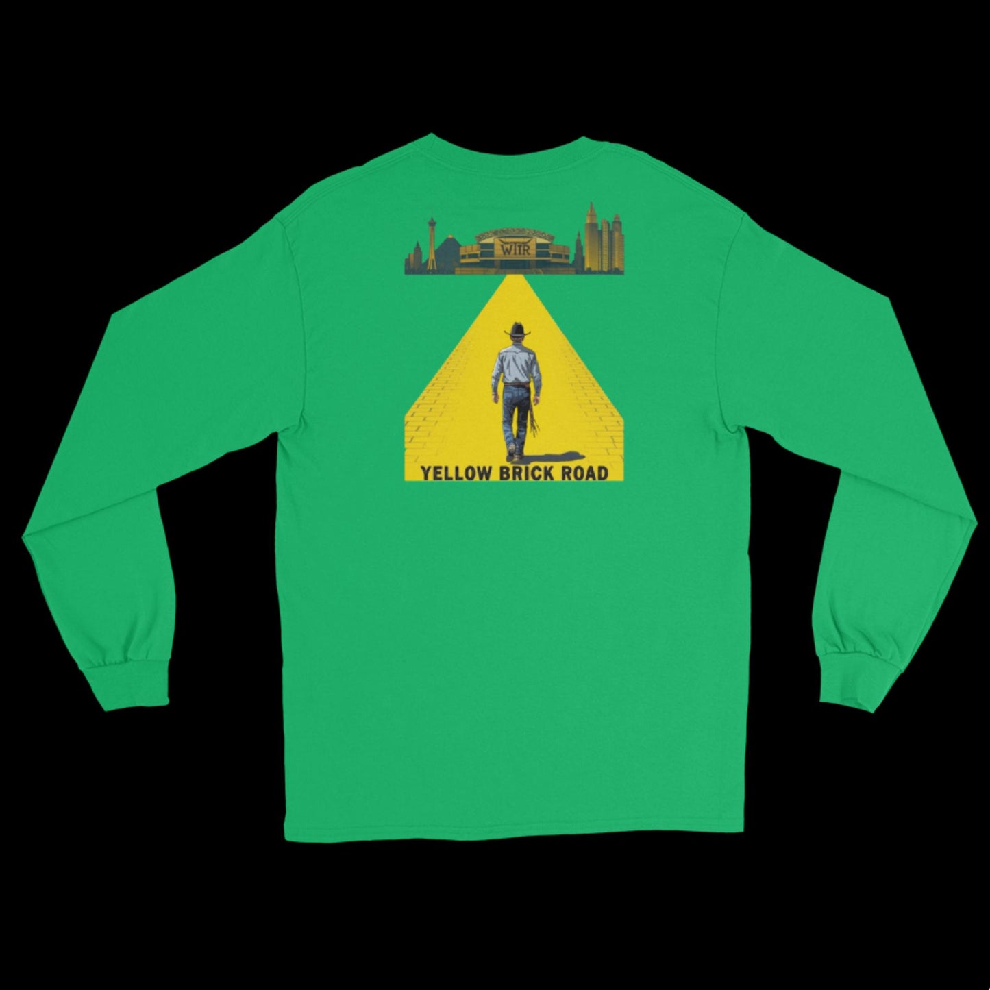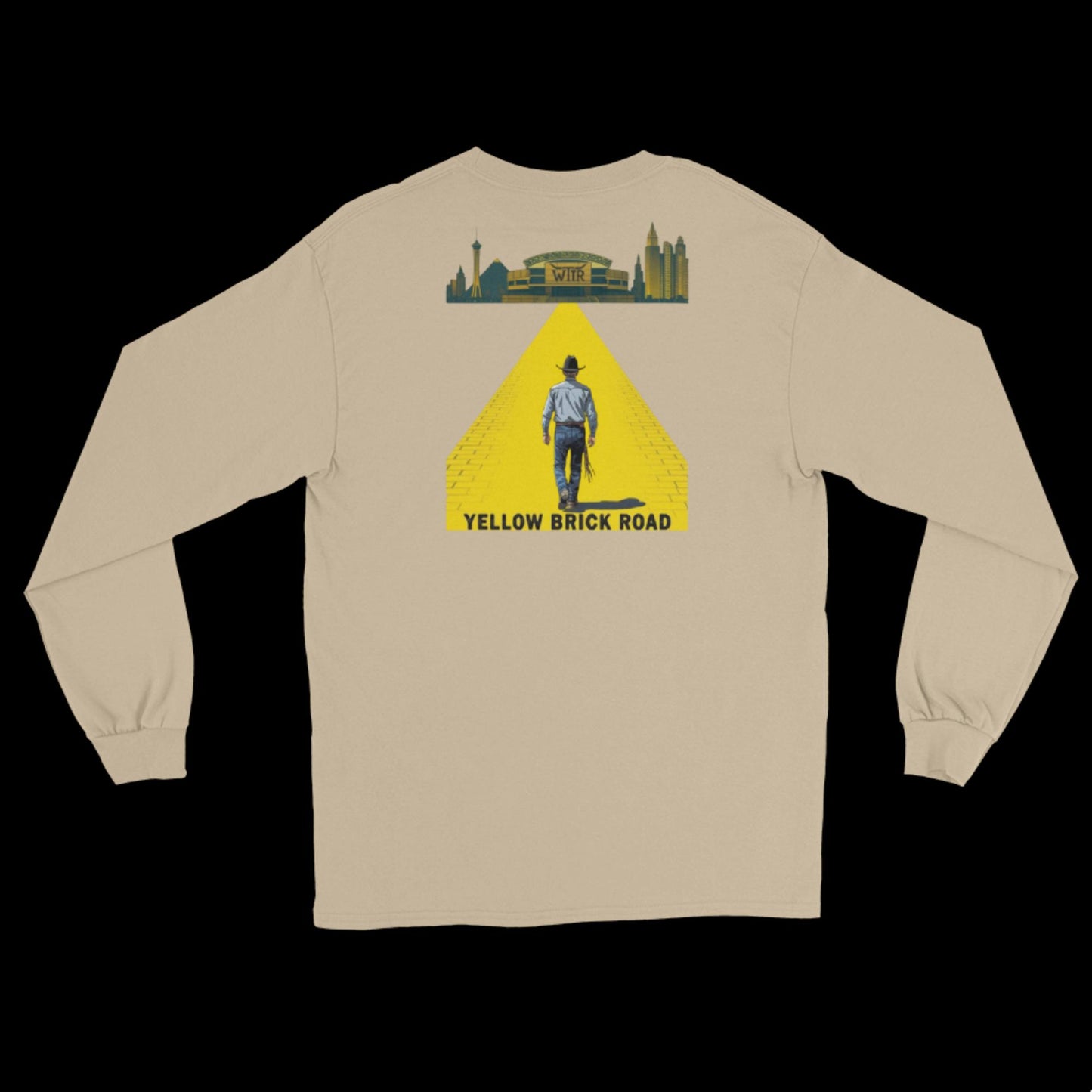 The Yellow Brick Road Cowboy long sleeve T-Shirt captures the spirit of every cowboy chasing their biggest dreams—step by step, brick by brick, down the golden path to the bright lights and big arenas of Las Vegas. This bold design features a lone cowboy walking toward a WTTR arena, framed by the Vegas skyline, symbolizing ambition, grit, and the pursuit of rodeo glory.