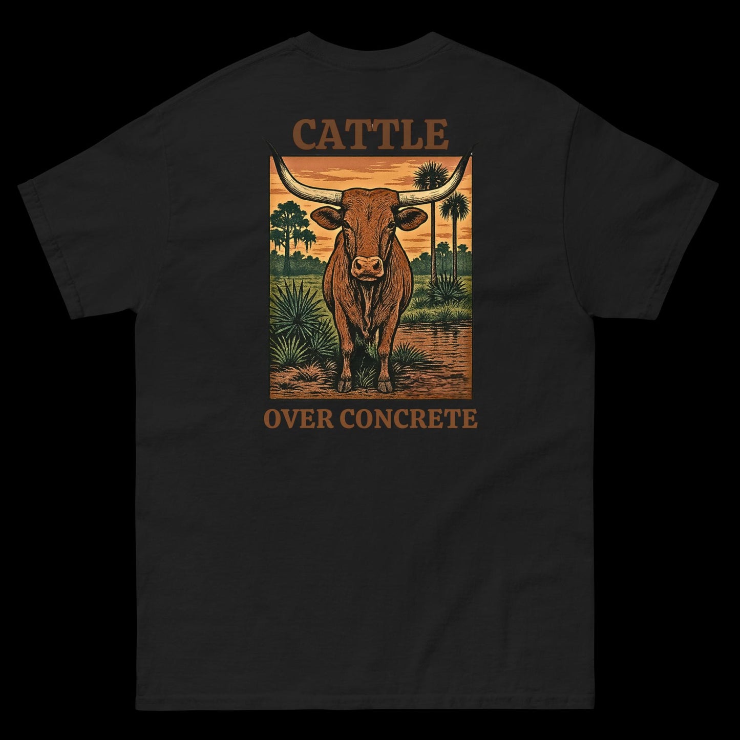 The “Cattle Over Concrete” tee is part of our Rural Resistance line — made for the ones who’d rather see wide-open pastures than concrete jungles.