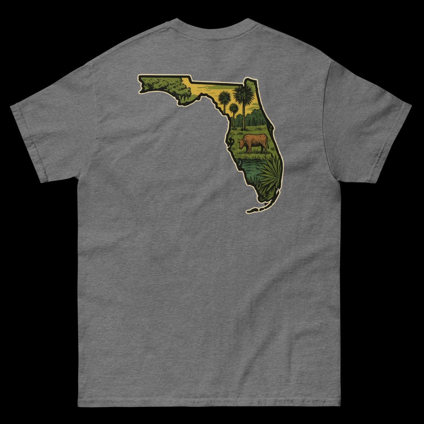 Show your Florida pride with some serious Brahma bull swagger. This bold tee features a Brahma steer inside the shape of Florida, calling attention to the roots of rural life, heritage cattle, and the fight to preserve agricultural spaces. Tough, iconic, and unmistakably Florida.