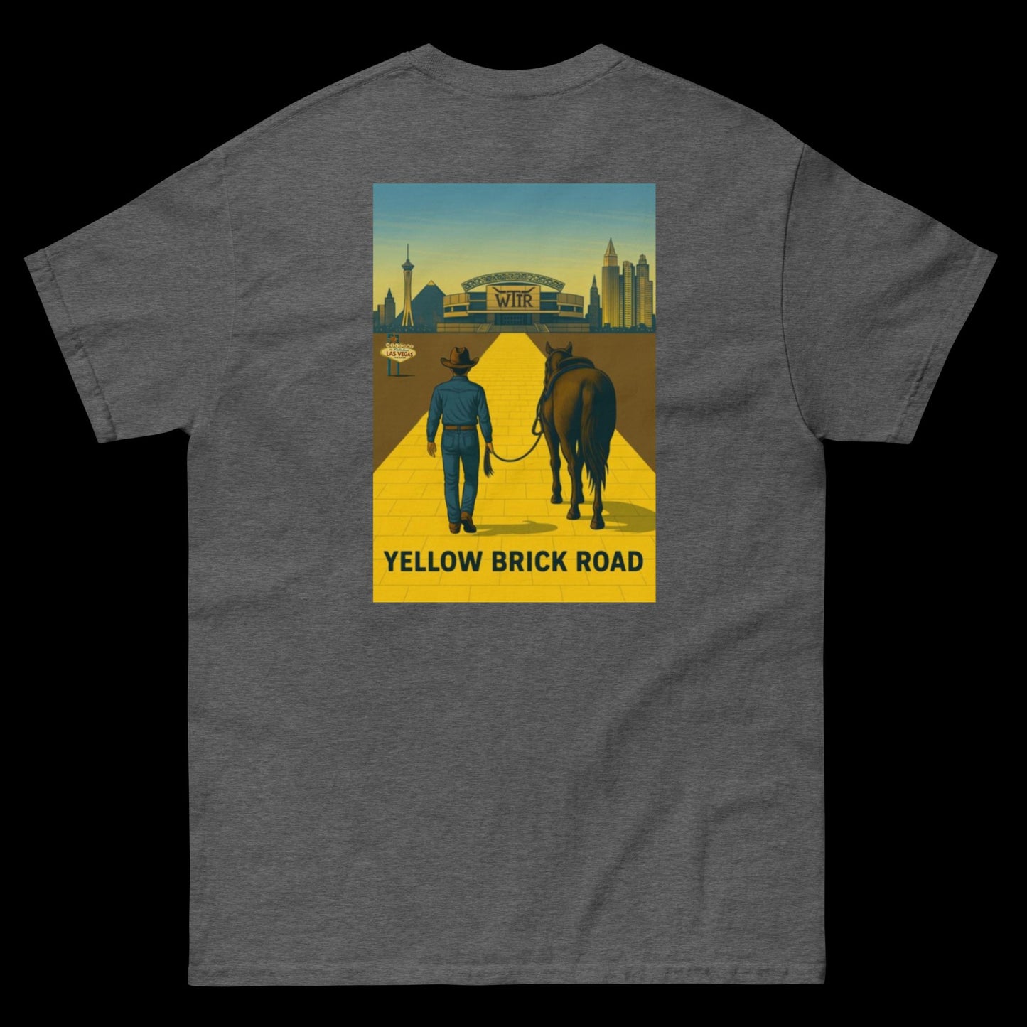 One cowboy, one dream, and a road paved in dust and determination. This Vegas Sign Edition of the Yellow Brick Road tee captures the spirit of rough stock riders chasing their shot at glory under the bright lights of the biggest rodeo event in the US. It’s western, it’s wild, and it’s built for those who live life eight seconds at a time.